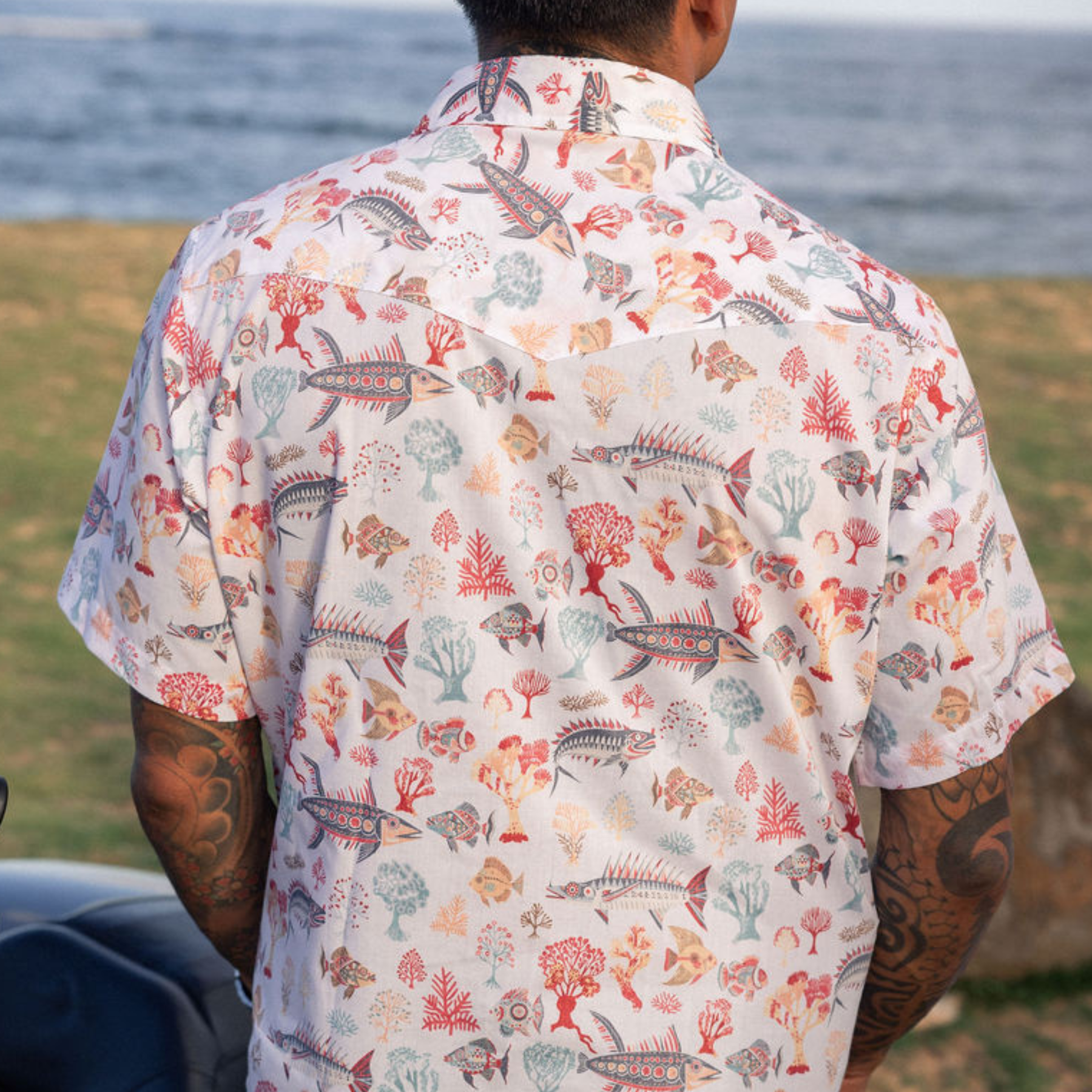 Our Reef Rage print tells the story of the dangers of being a Hawaiian reef fish with barracuda on the prowl.